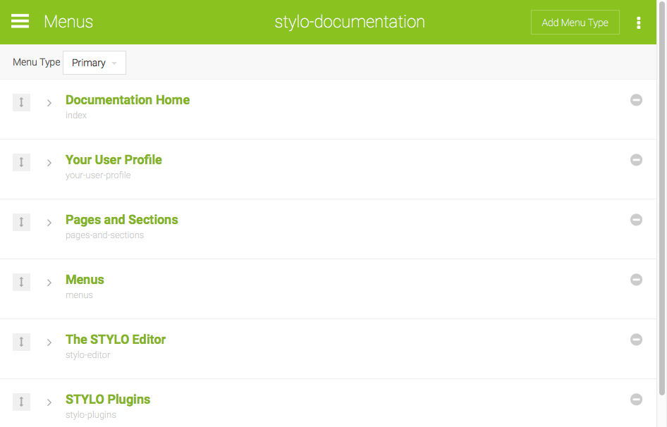 The Primary menu is the menu that appears at the top of you website in the header. The Footer menu appears at the bottom of your website in the footer area. Your site may have other menus already defined. You can also create your own menus that can be included on your pages using the Rich Widget in the STYLO Editor.