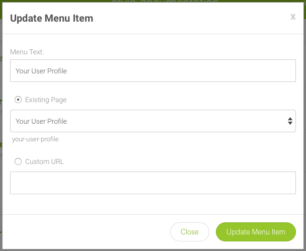Clicking a menu item opens the Update Menu Item pop up dialogue.