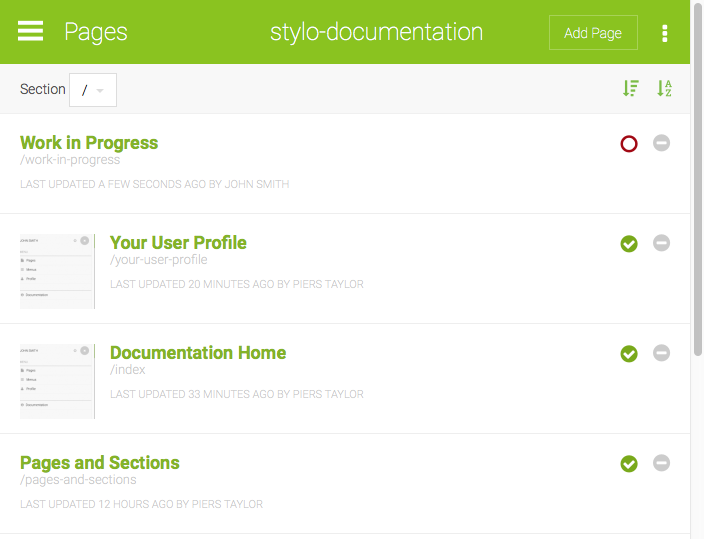 Pages in the current section are sorted by the last modified date, with the latest updated page at the top. You can also order pages alphabetically using the icon. The icon sorts by last modified date.