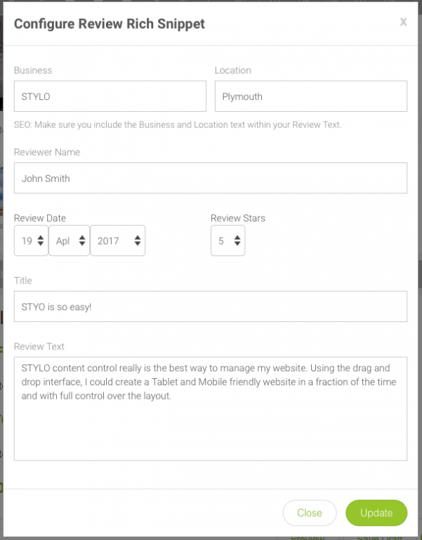 The Review Rich Snippet lets you create reviews on your website that include special structured data mark up that can be read by search engines and possibly enhance your search listings or rankings.